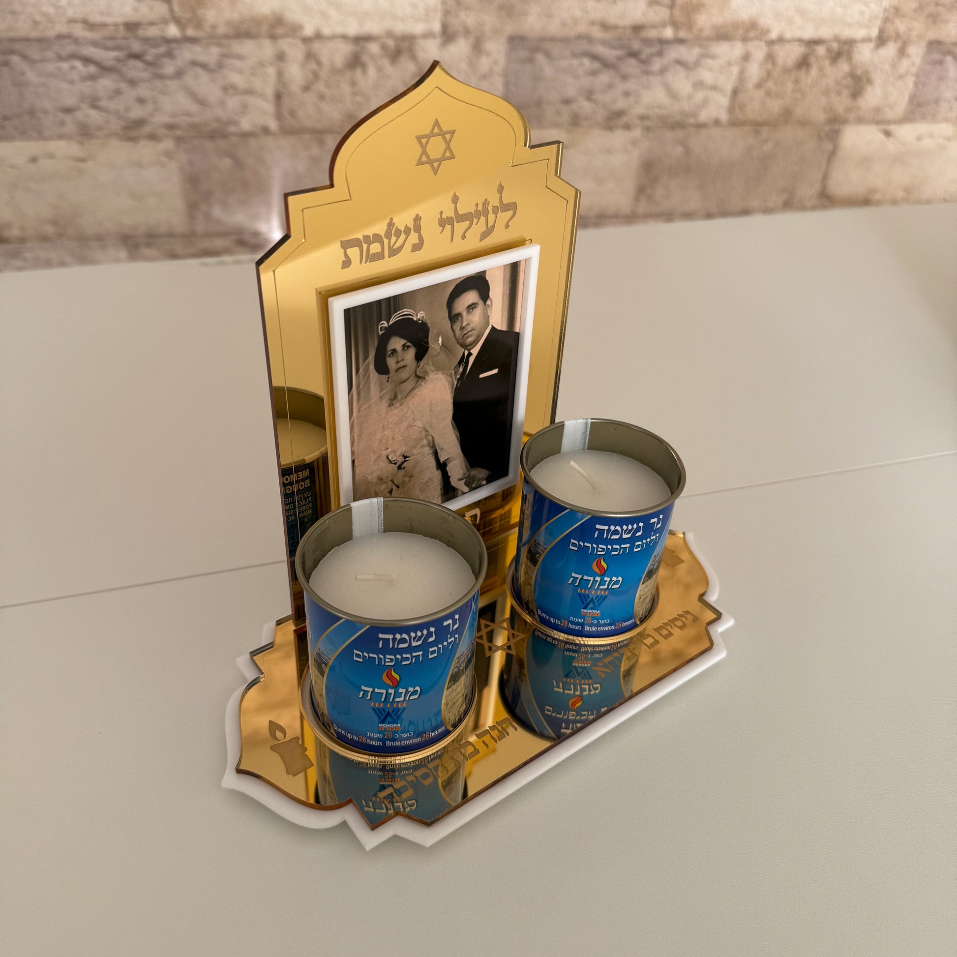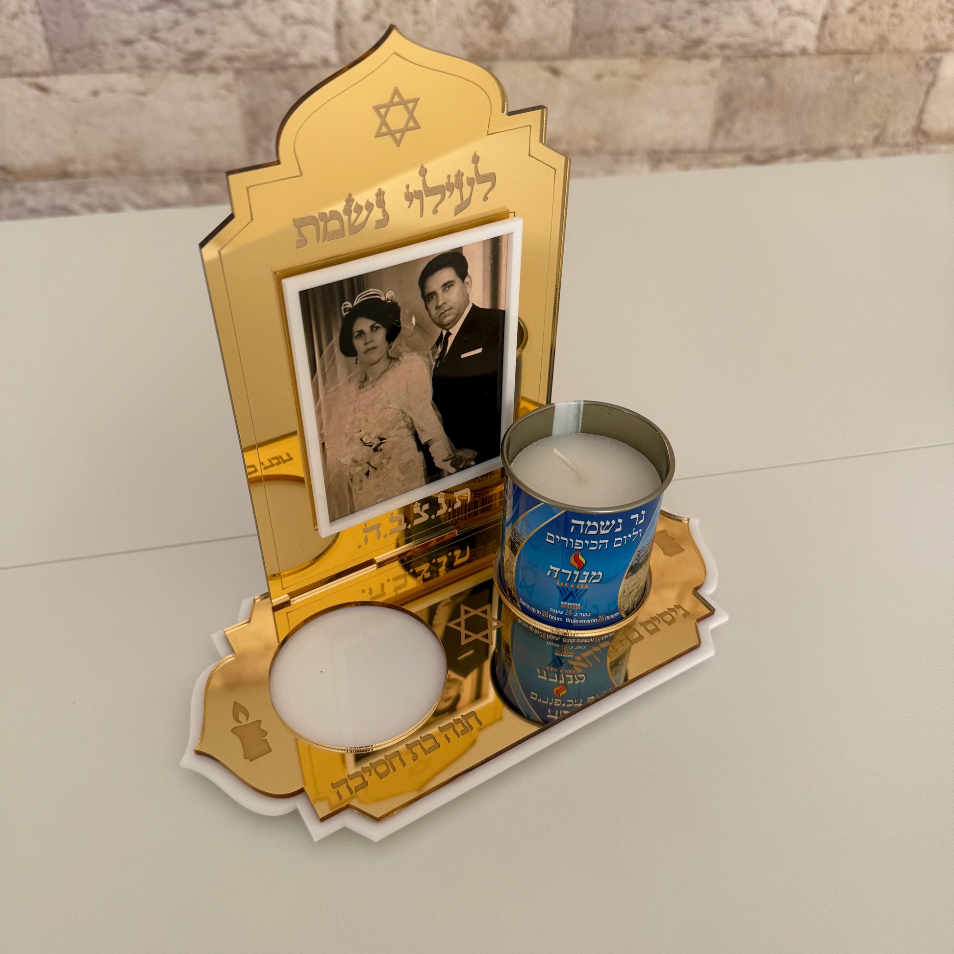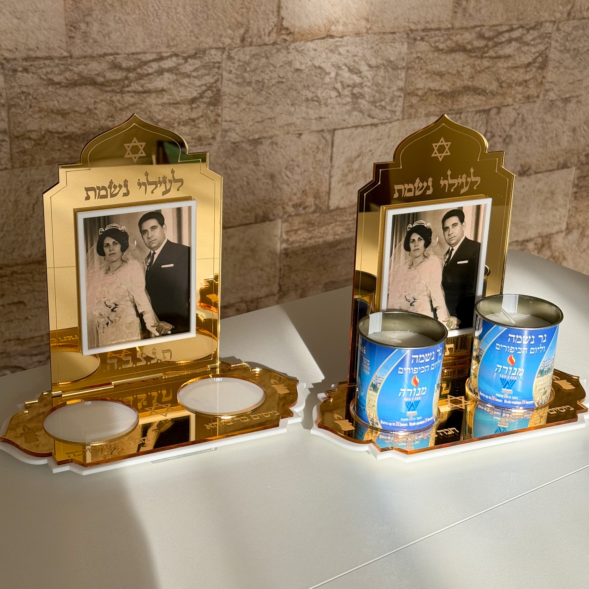 Honor the memory of your loved ones with this elegant double Ner Neshama holder, designed to hold two memorial candles side by side. Featuring a framed photo area and personalized engraving, it serves as a meaningful tribute to a couple or two family members who have passed away.