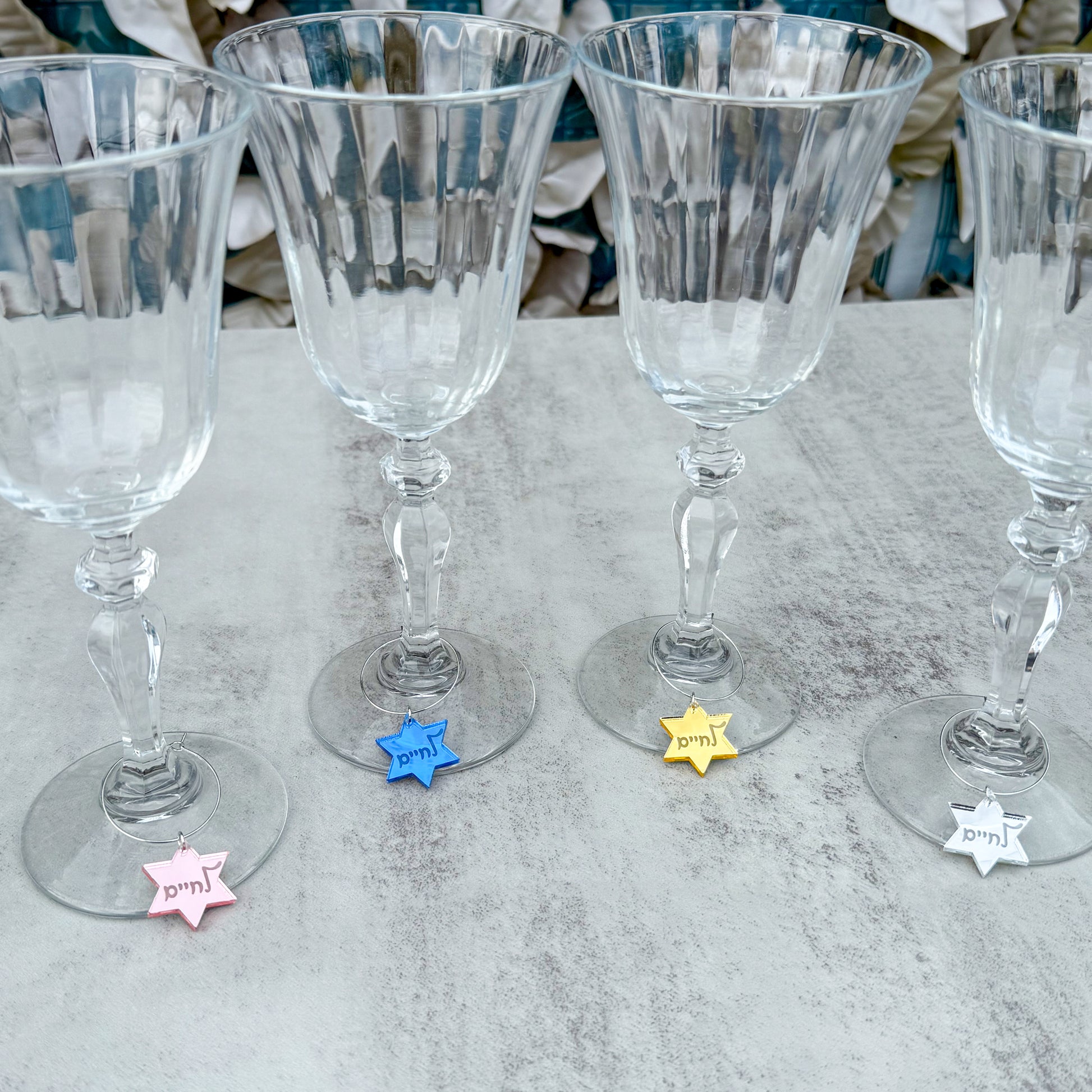 Precision laser-cut stars with engraved lettering create a polished look that elevates any wine glass while helping guests easily identify their drink. Symbolic, stylish, and a beautiful nod to Jewish heritage.