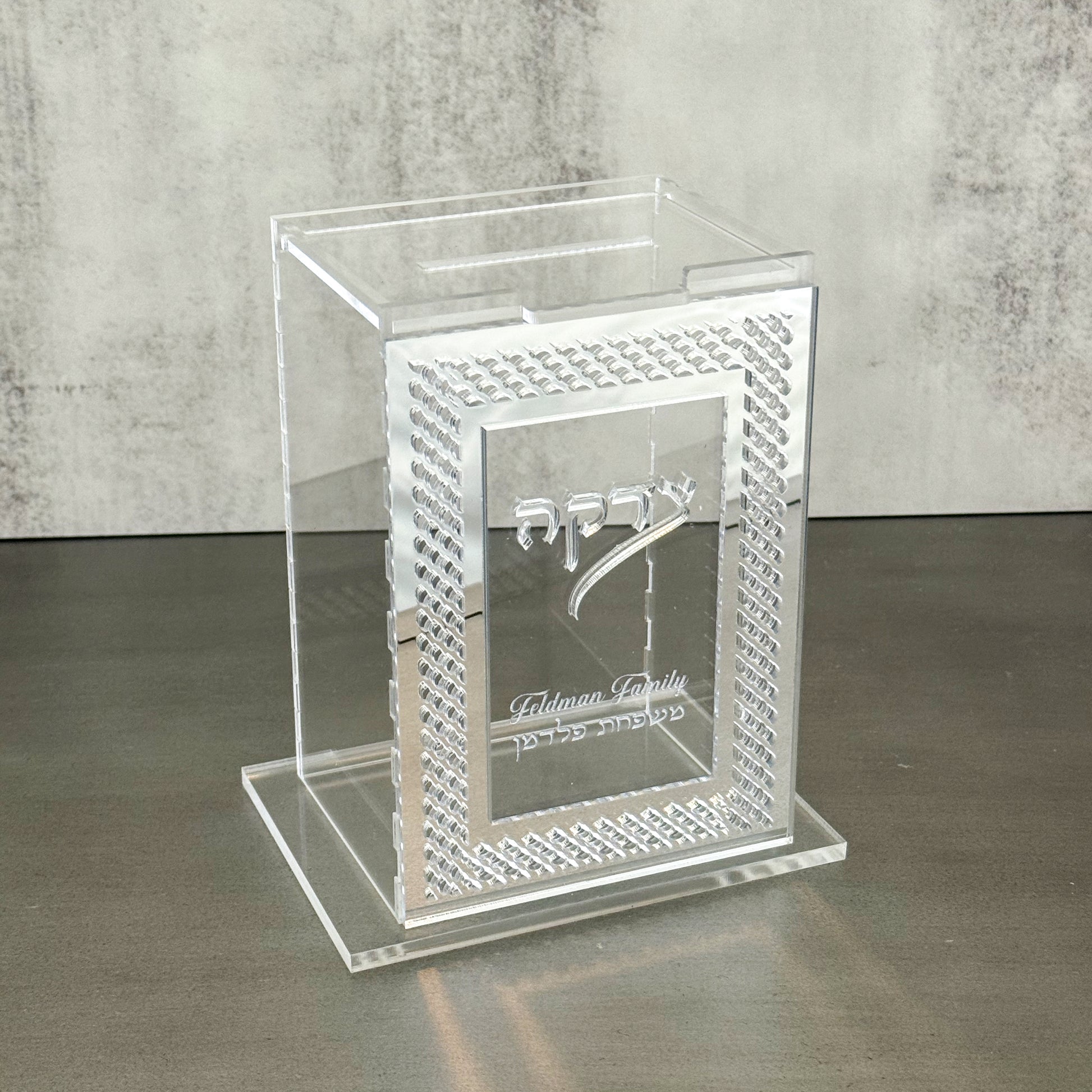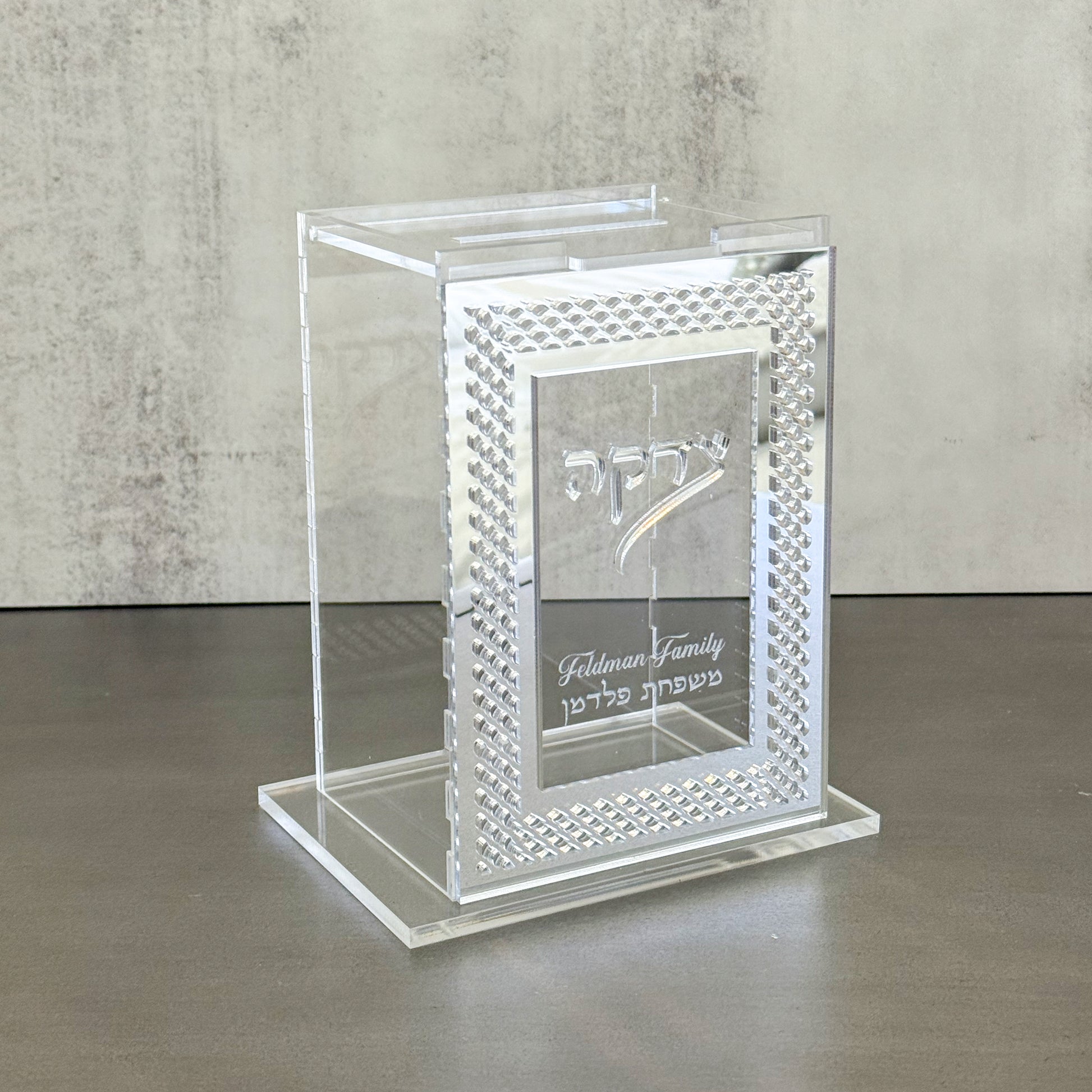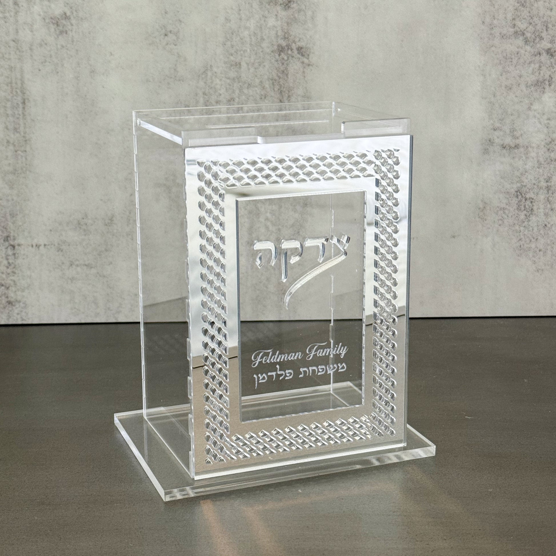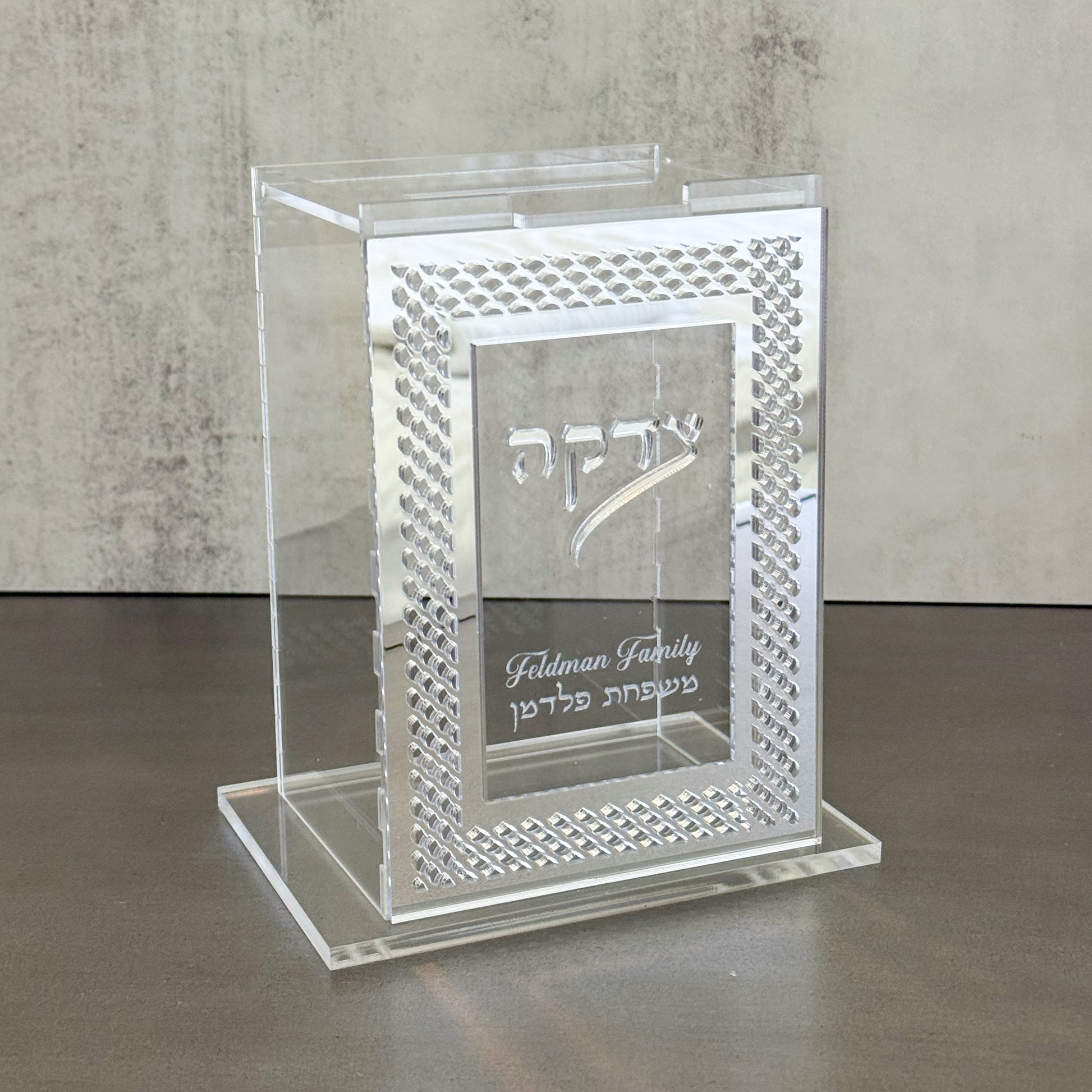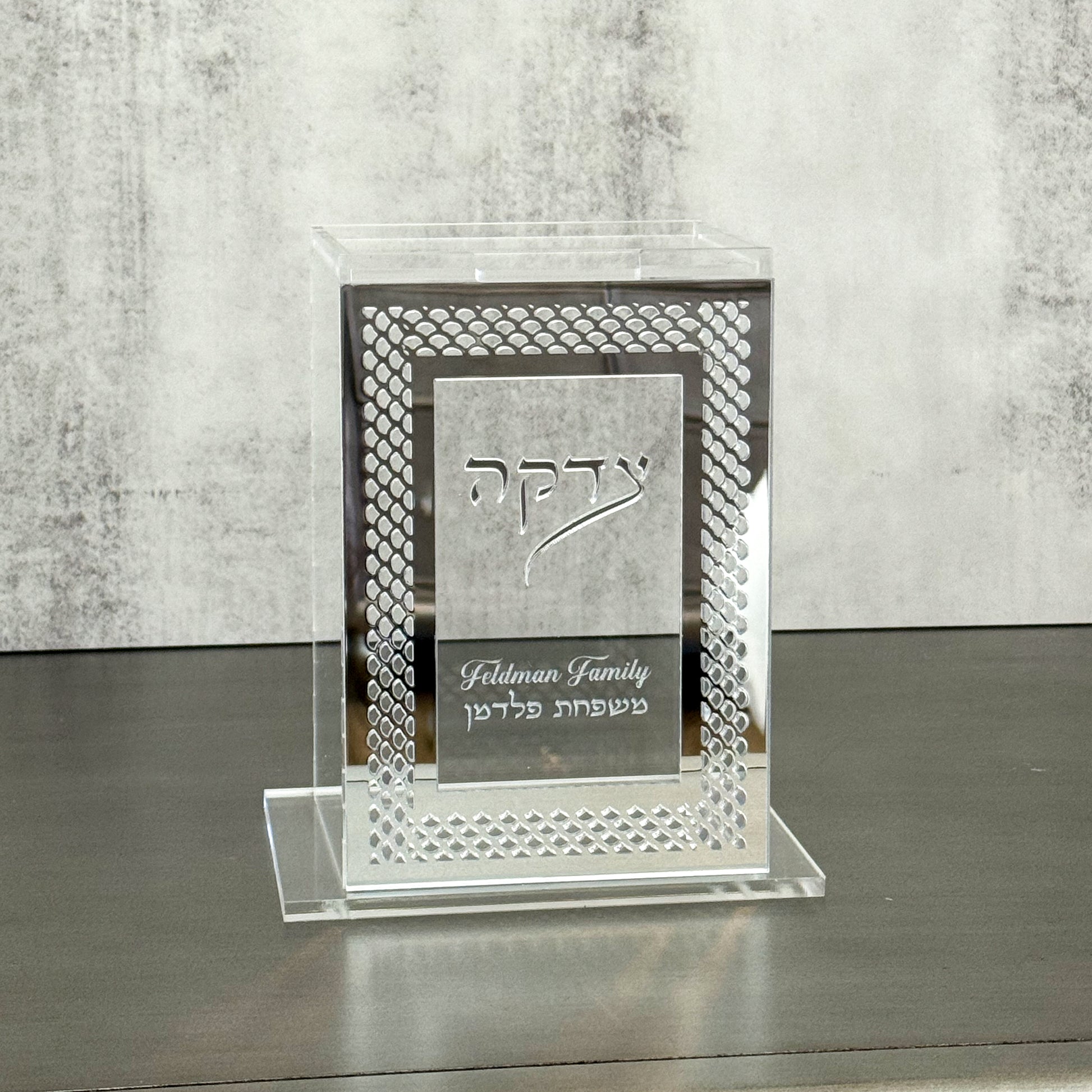 Measuring 6.25" x 5.4" x 3.25", it features a clear, sturdy structure accented by a beautifully intricate mirror border, available in your choice of silver, gold, rose gold, bronze, or blue mirror. The front showcases a raised acrylic “צדקה” and includes a custom-engraved family name, making it a meaningful heirloom for generations.