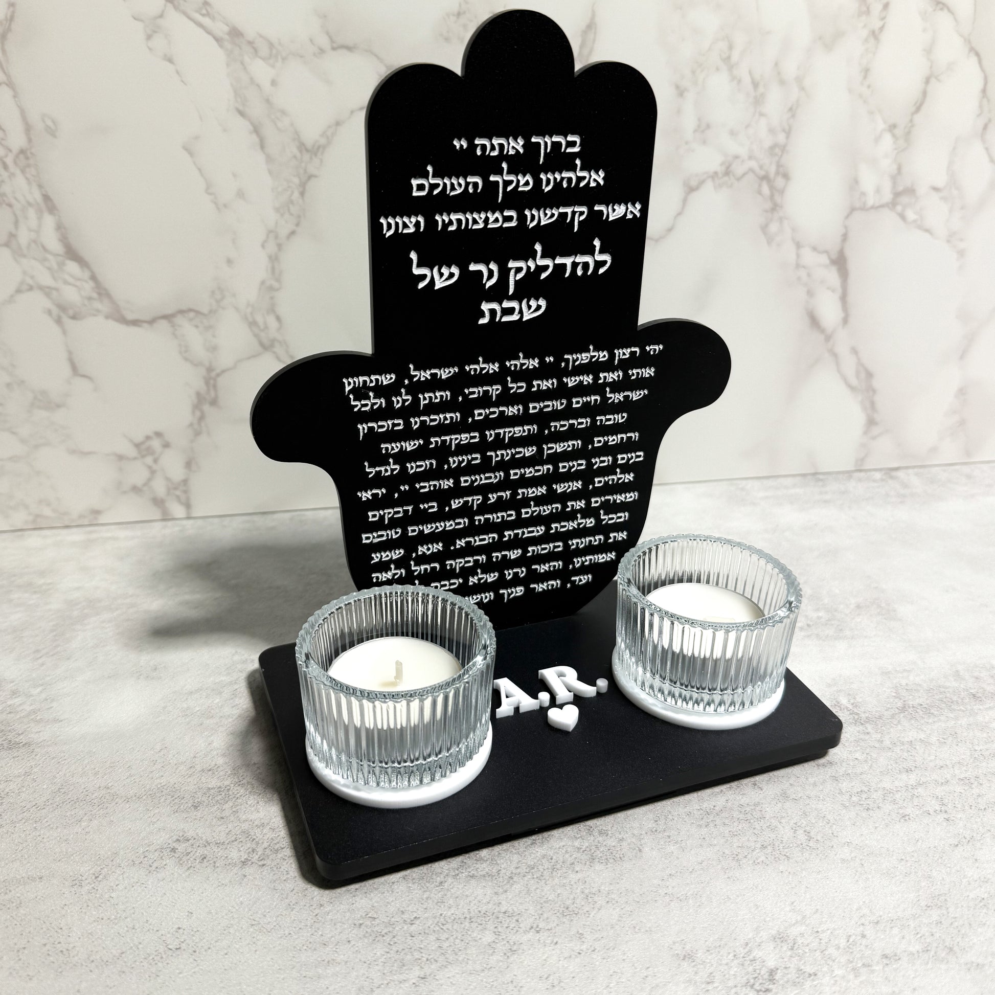 Create a meaningful and modern Shabbat moment with this stunning black matte Hamsa candle holder. Designed with clean lines and crisp engraved Hebrew text, this piece brings a sense of beauty, intention, and protection to your candle-lighting ritual. The 3D personalized initials add a heartfelt touch, making it perfect for newlyweds, new homes, or anyone who cherishes elevated Judaica.
