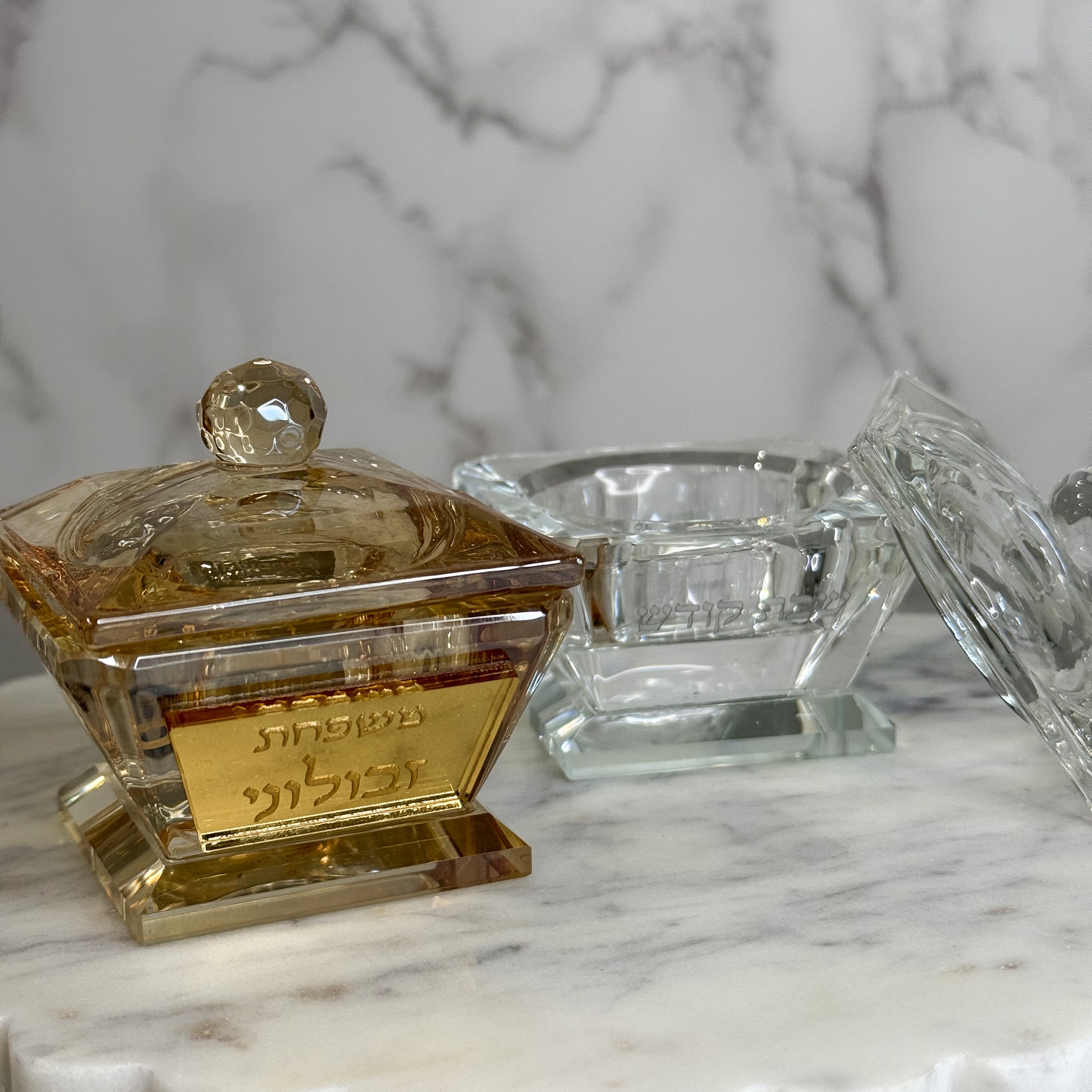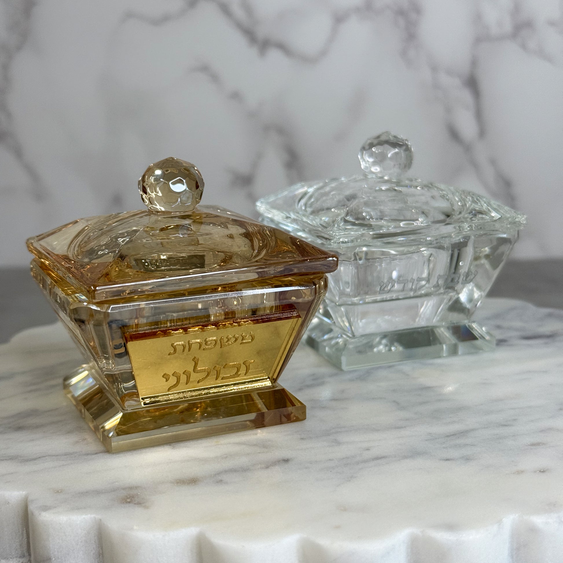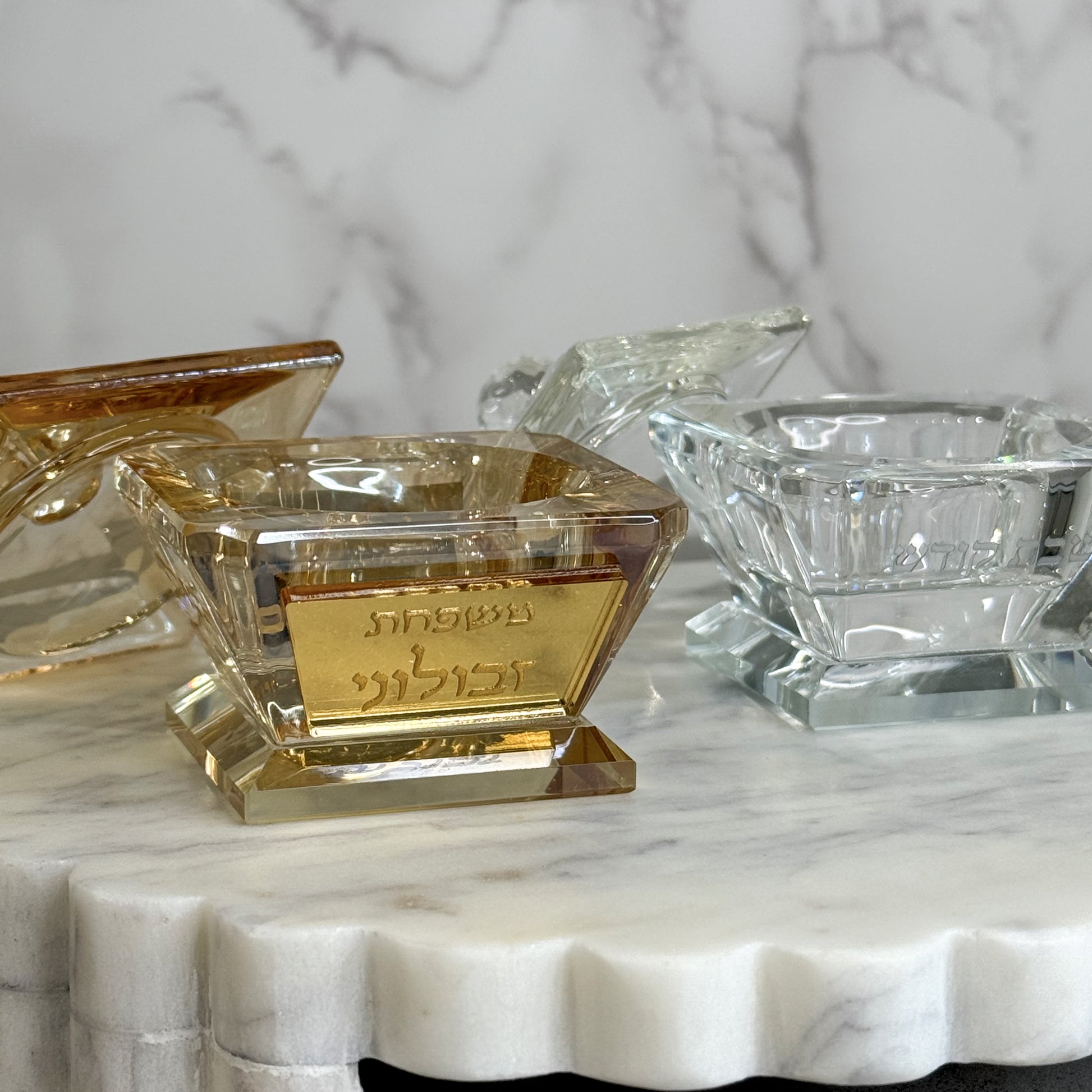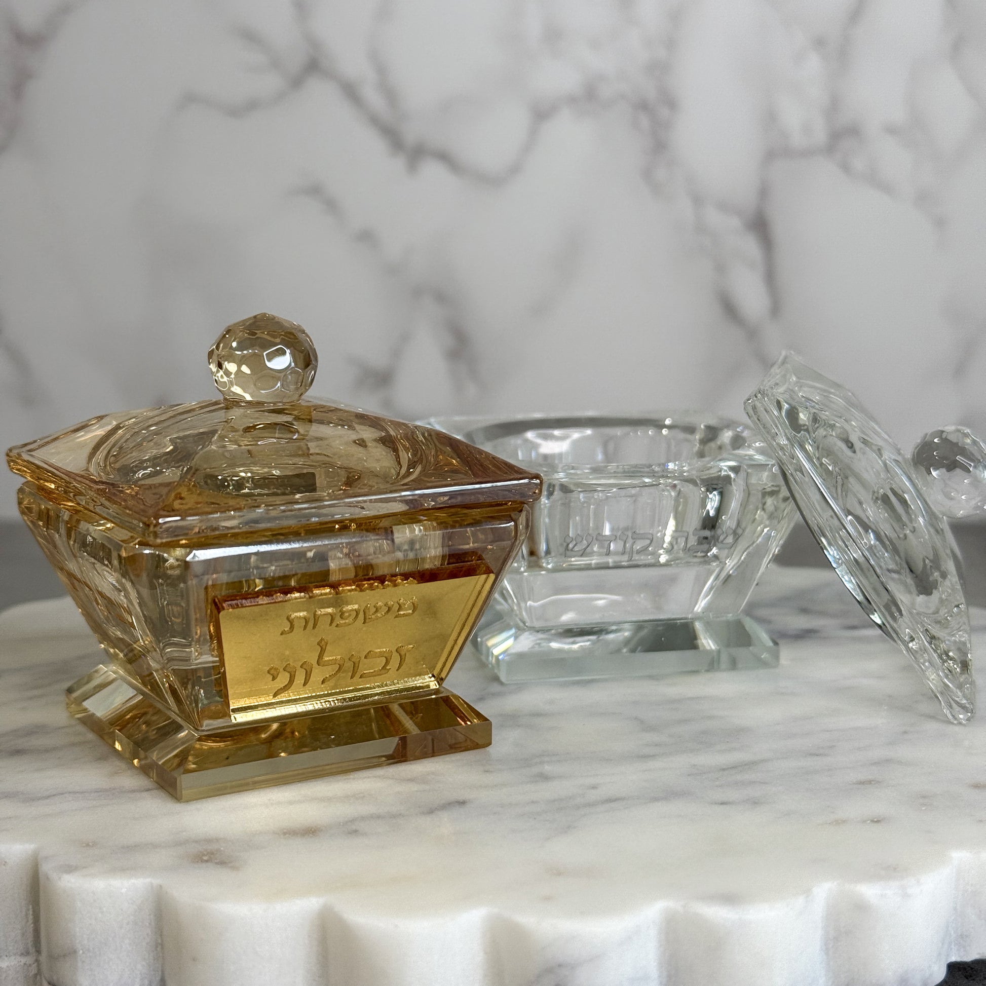 Available in classic crystal clear or gold crystal, these salt pots are both decorative and functional. Each piece is personalized with your family name on both sides, creating a meaningful detail that makes your Kiddush ritual feel even more special.