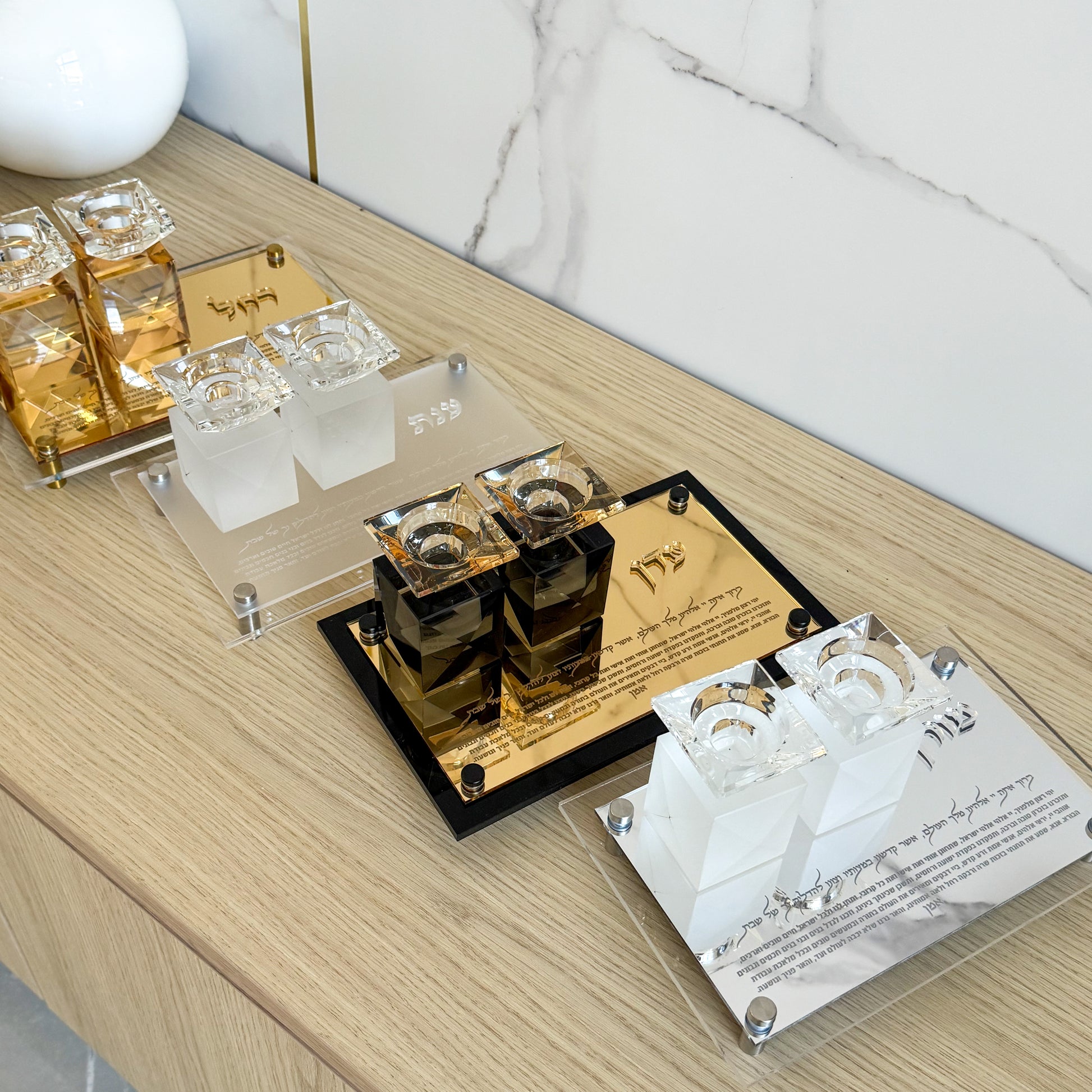 Bold, modern, and striking — our Gold on Black Shabbat Candle Holder Set is designed for those who love a dramatic and luxurious aesthetic. The rich black base enhances the brilliance of the gold mirror top layer, engraved with the Shabbat candle blessing and Yehi Ratzon for a meaningful touch.