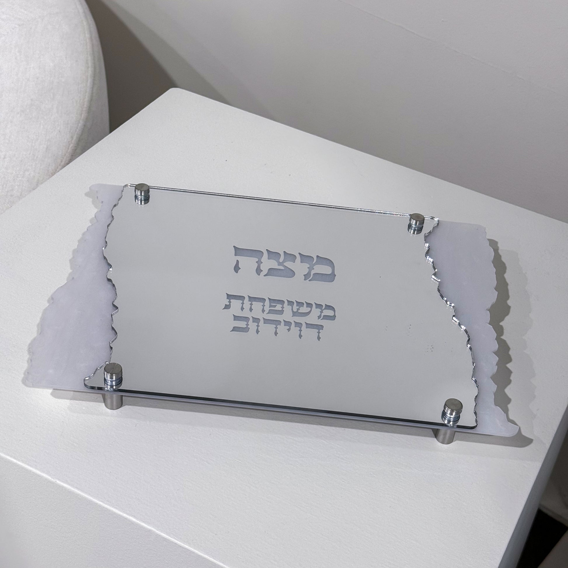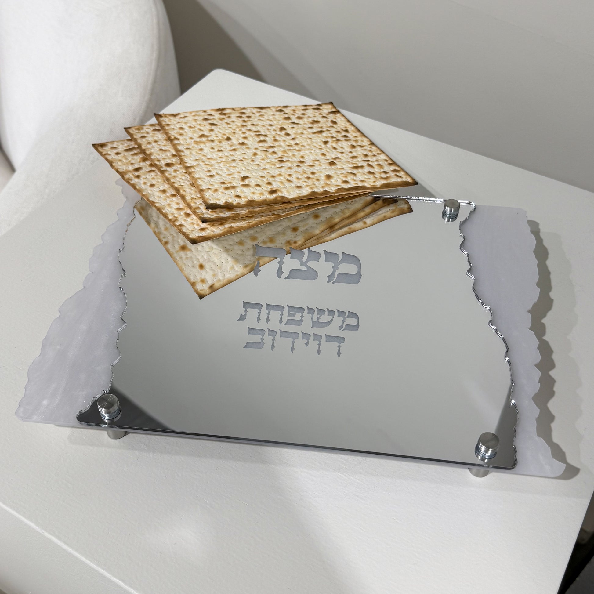 Clean, modern, and made for the heart of your Seder table. This personalized matzah tray is crafted from luminous white pearl acrylic and layered with sleek silver mirror on top, finished with signature matzah-inspired edges for a refined Passover look. Engraved with מצה and personalized with your family name, this tray is designed to feel elevated, intentional, and beautifully cohesive with the rest of your Passover collection.