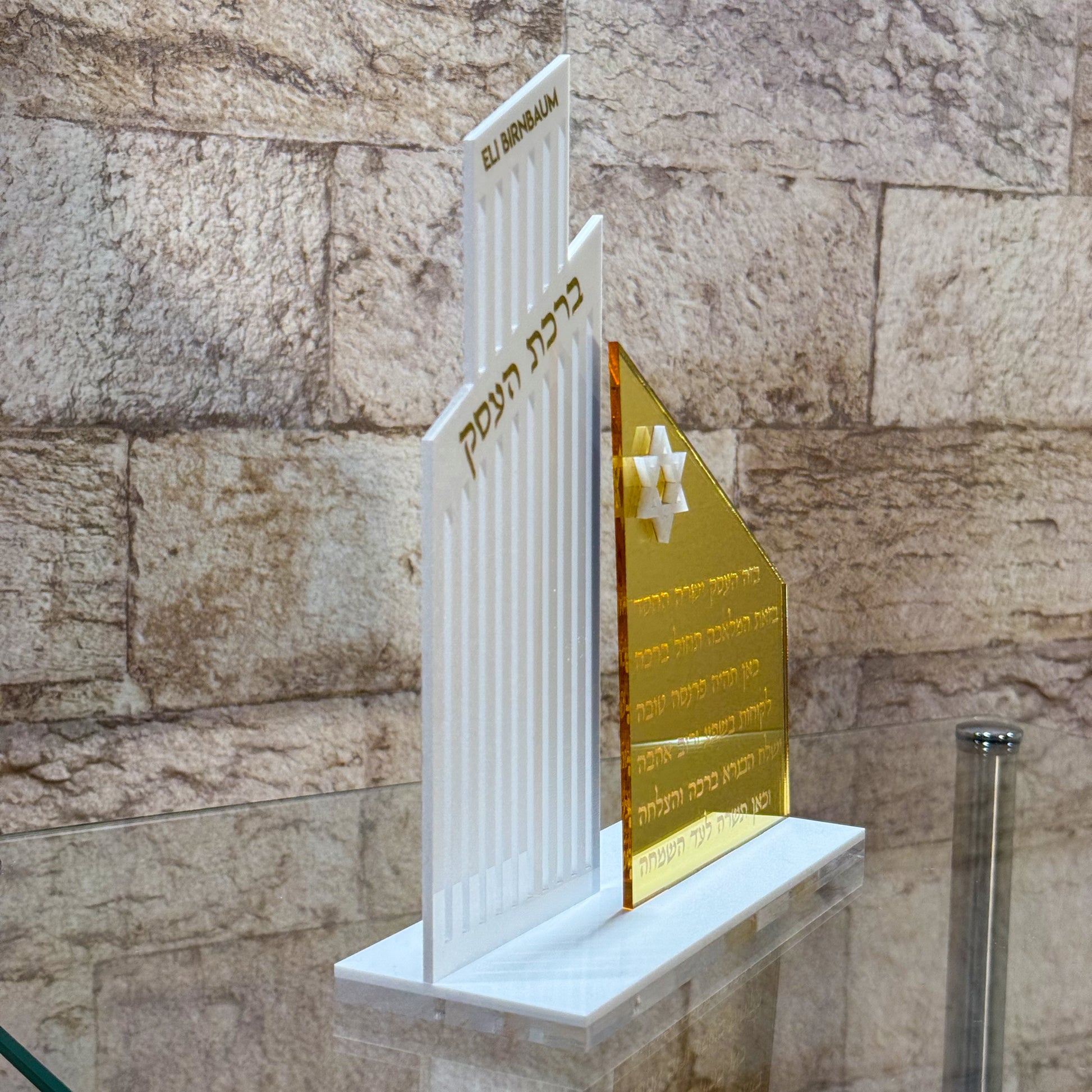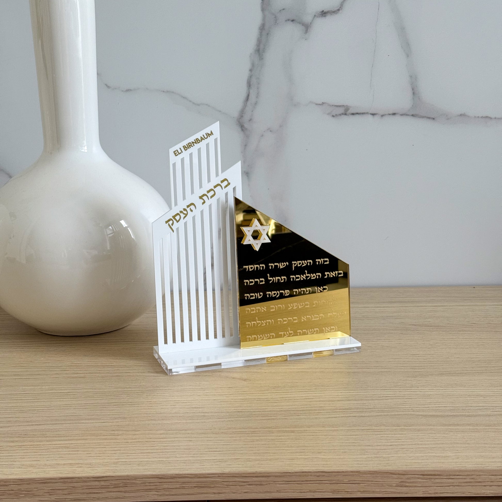 Engraved with the traditional Birkat Ha’Esek (Business Blessing) in Hebrew, this stand is crafted from premium acrylic and layered for a clean, architectural look. Whether displayed in a real estate office, home workspace, or closing gift presentation, it offers a beautiful reminder of success, integrity, and blessing in one’s work.