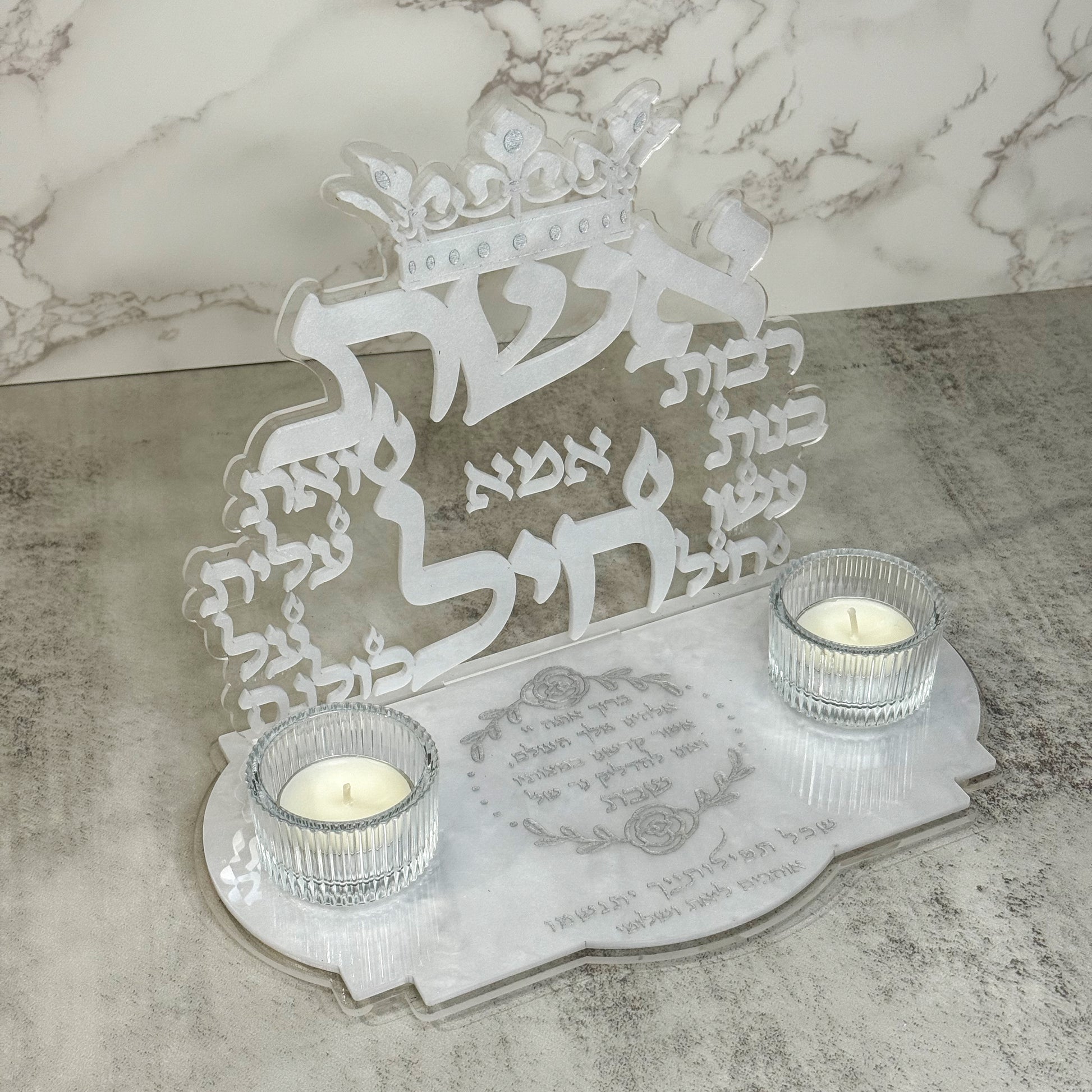 Enhance your Shabbat candle-lighting ritual with this stunning personalized acrylic Shabbat candle tray, designed to bring beauty, meaning, and modern elegance to your home. Crafted from high-quality laser-cut acrylic, this piece features the full Shabbat candle-lighting blessing engraved in Hebrew, along with a graceful Eshet Chayil stand that creates a meaningful display.